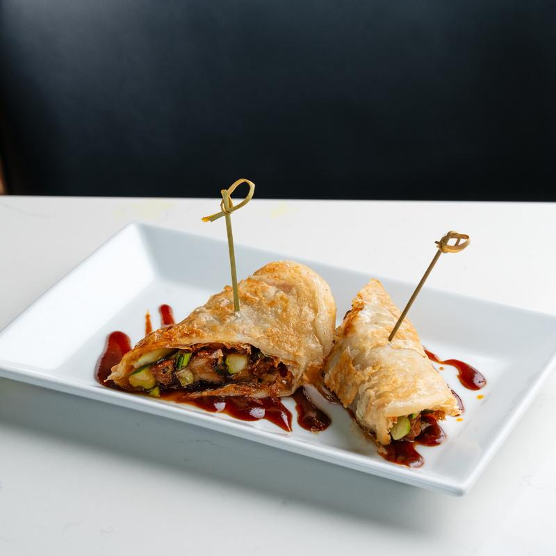 Flatted Bread, crispy duck, green onions, cucumbers & duck sauce.