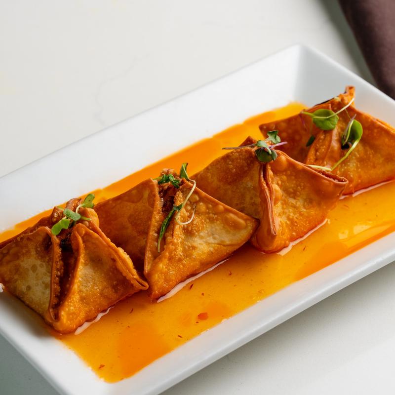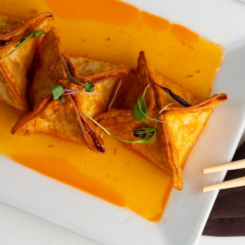 Imitated crab meat, cream cheese, wonton wrapper and sweet sour sauce.