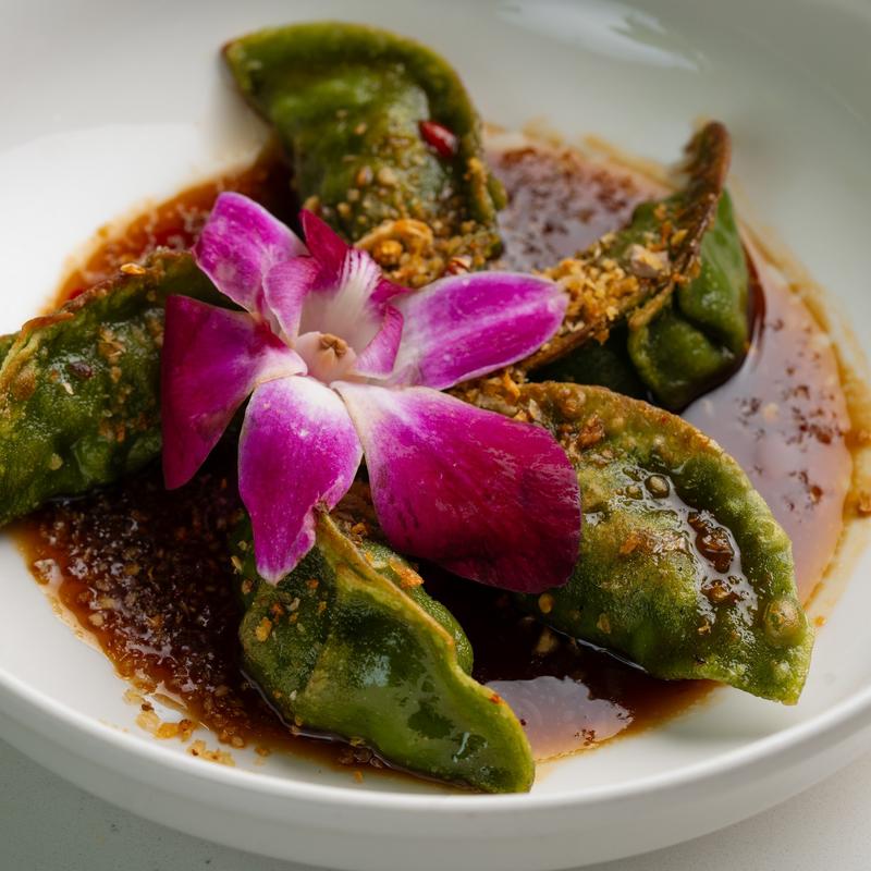 Shrimp, chicken, carrots, green onions, and shiitake mushrooms with spicy sesame-chili oil sauce.